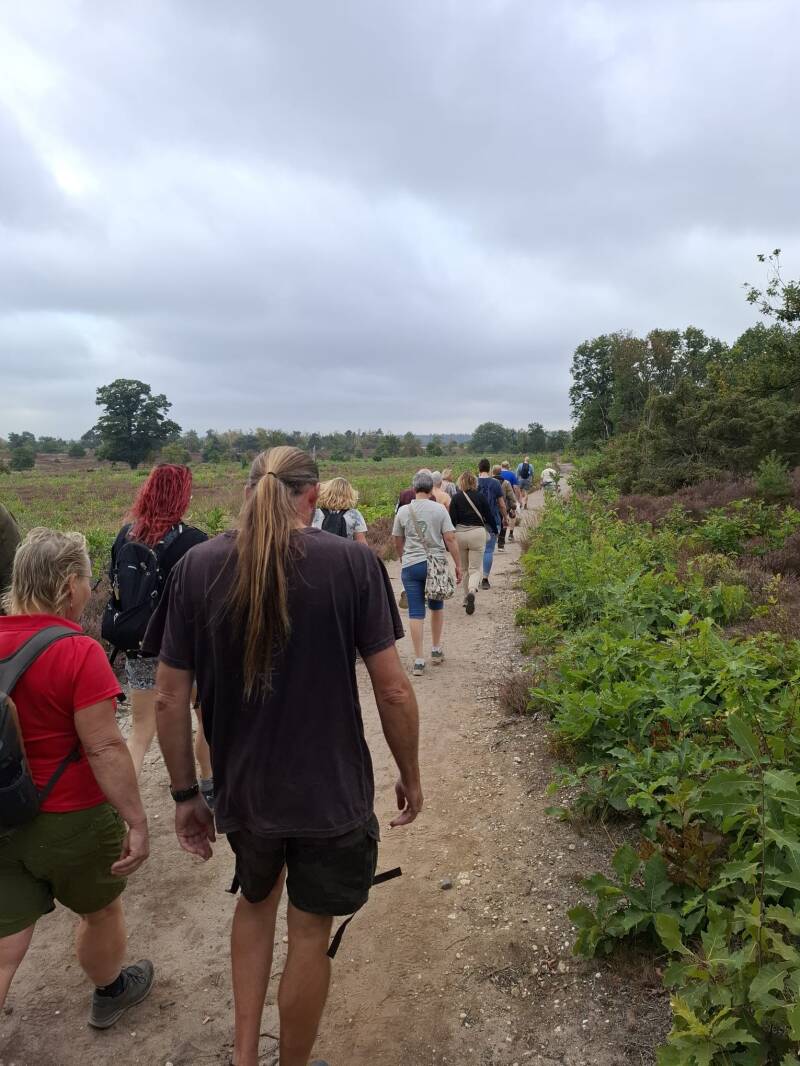 Vandaag stond er een speciale wens op het programma: een wandeling langs de uitbundig bloeiende heidevelden. Met de meteorologische herfst vlák om de hoek – nog maar twee nachtjes slapen – was het nu of nooit. Dus daar stonden we, een bonte groep van 22 enthousiaste wandelaars bij het buitencentrum van de Sallandse Heuvelrug, alvast druk in de weer met het testen van de sanitaire voorzieningen.