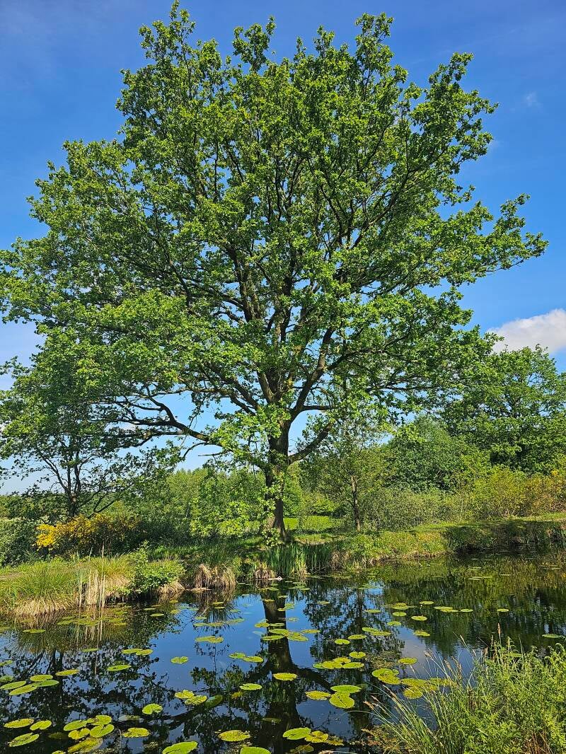 Langs de route stonden informatieve bordjes, die we natuurlijk allemaal braaf lazen – of deden alsof. Bij onze traditionele pauzeplek, de eik van Borrenbergs (150-200 jaar oud en duidelijk niet van plan om te knuffelen), probeerden we nog een poging tot “boomknuffelen”. De eik reageerde hierop met een stille, majestueuze afwijzing, dus besloten we maar snel door te lopen.