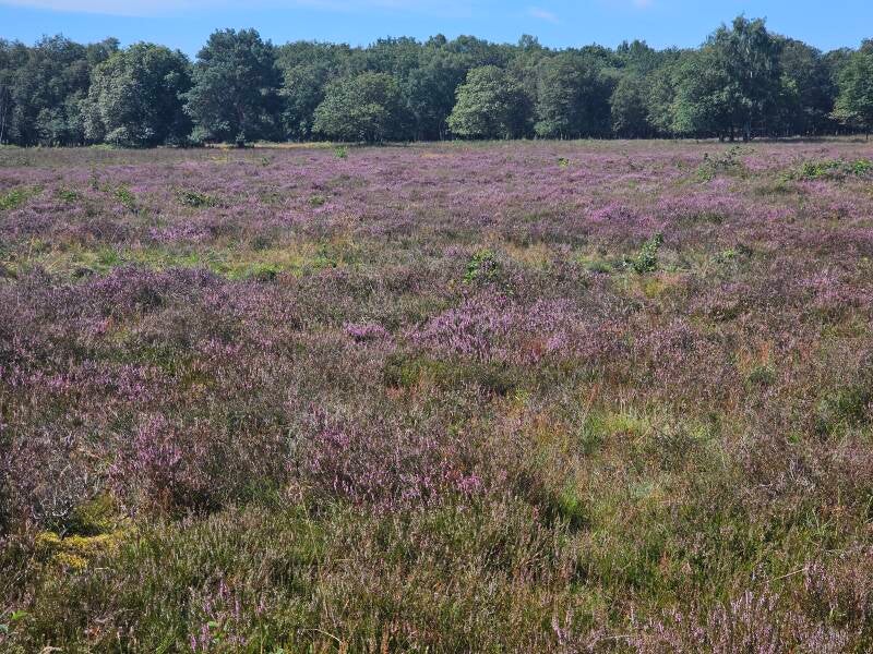 Na een korte warming-up door het kabouterbos – tot teleurstelling van sommigen helaas zonder kabouters – doken we de paarse zee van bloeiende heide in. Dat bleef niet onopgemerkt: het gezelschap viel al snel uiteen in een lang lint, vooral omdat er driftig werd geposeerd voor de perfecte heidefoto, uiteraard bestemd voor de socials.