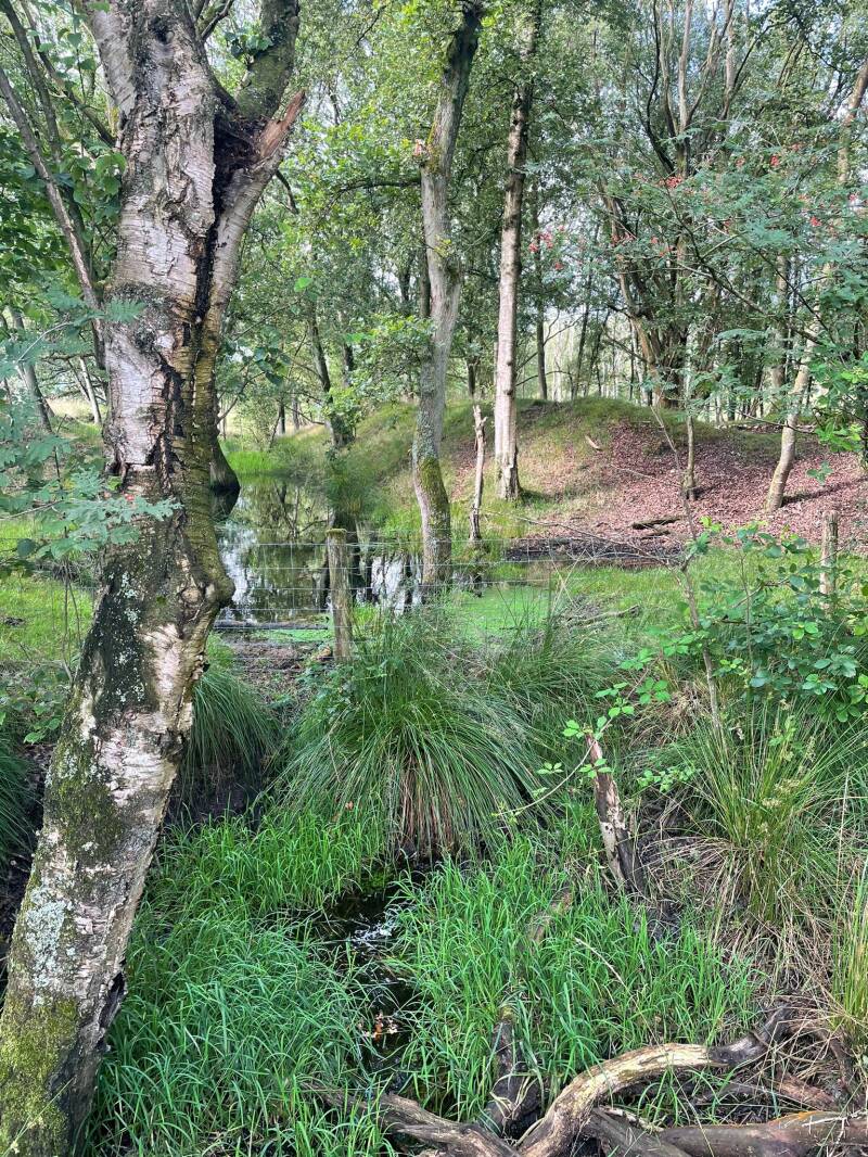 De route zelf was een waar avontuur: smalle kronkelpaadjes door het bos, langs bomen die waarschijnlijk meer geheimen kennen dan wij. Het Hulsbeek is een soort natuur-alles-in-één-pakket: waterplassen, hei, bossen, een beek met ijsvogel-nestgaten (voor de vogelliefhebbers onder ons) en zelfs een landschapstuin die al meer dan 100 jaar oud is. De beukenlaan, die we passeerden, is zo oud dat ‘ie waarschijnlijk nog de uitvinding van de fiets heeft meegemaakt.