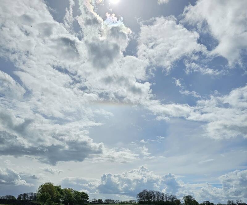 Het laatste stukje naar Winsum, een tocht van zo’n 6 kilometer, voelt bijna als een formaliteit. Maar de natuur heeft nog een laatste verrassing in petto: de luchten links en rechts van ons zijn spectaculair. Zonnestralen breken door donkere wolken, en in het noorden siert een regenboog de horizon. We lopen in stilte, genietend van het moment, tot het vrolijke gekwetter in onze groep de stemming weer luchtig maakt.
